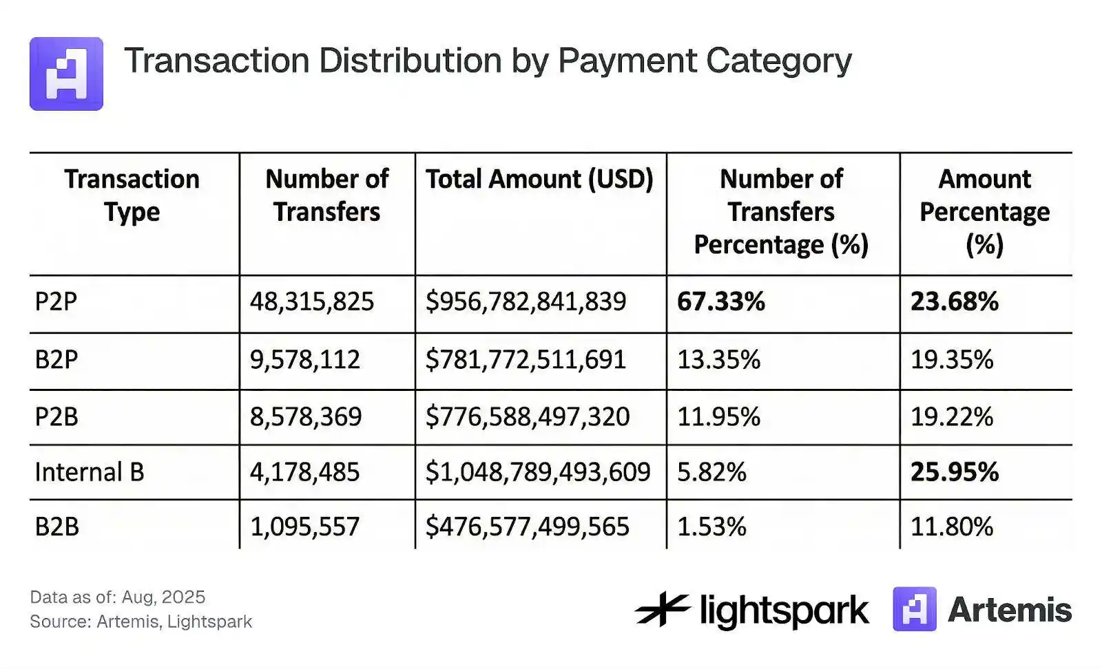 Bằng cách sử dụng thông tin nhãn do Artemis cung cấp, có thể phân tích sâu hơn các khoản thanh toán giữa hai EOA (Tài khoản Bên ngoài). Artemis cung cấp thông tin nhãn cho nhiều địa chỉ ví Ethereum, có thể xác định các ví do tổ chức (ví dụ: Coinbase) sở hữu. Chúng tôi phân loại các giao dịch thanh toán thành năm loại: P2P, B2B, B2P, P2B và Nội bộ B. Dưới đây là mô tả chi tiết cho từng loại.