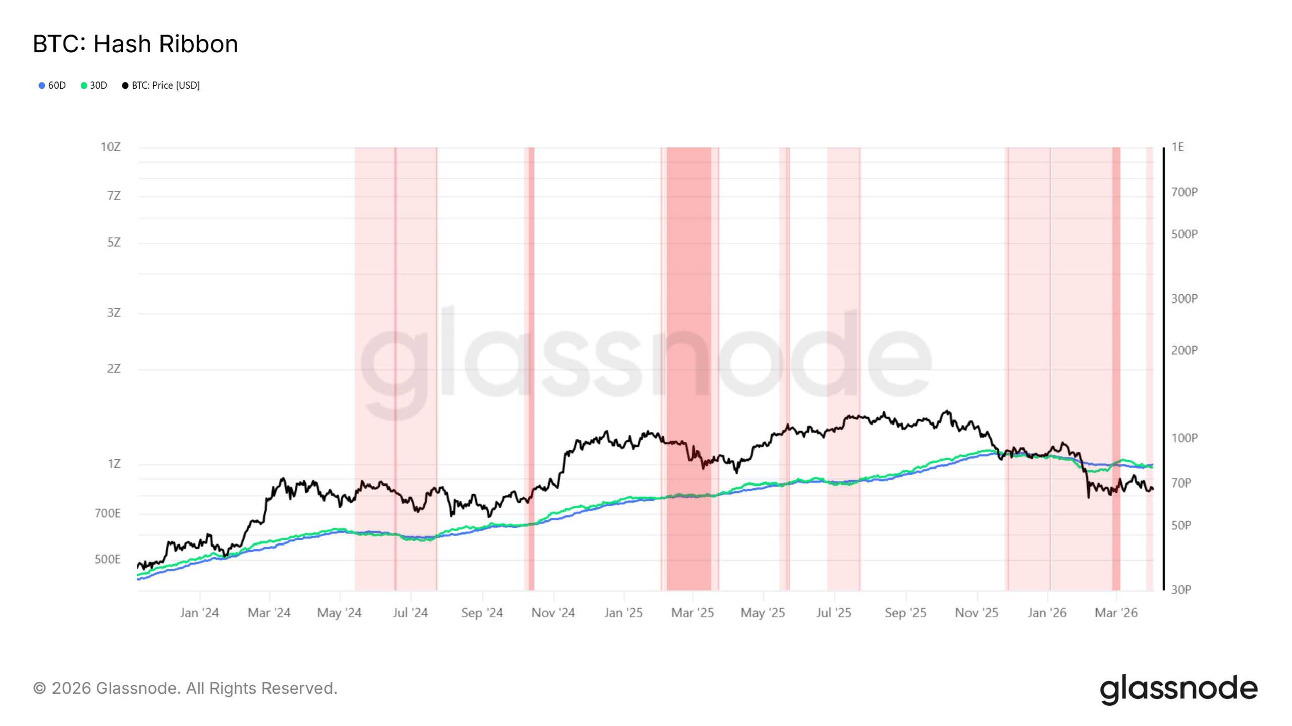 Tình trạng đau khổ này rõ rệt hơn vào cuối tháng 11 sau khi giá BTC giảm xuống dưới 90K USD. Điều này được theo dõi bởi chỉ số Hash Ribbon (các vùng được tô bóng).