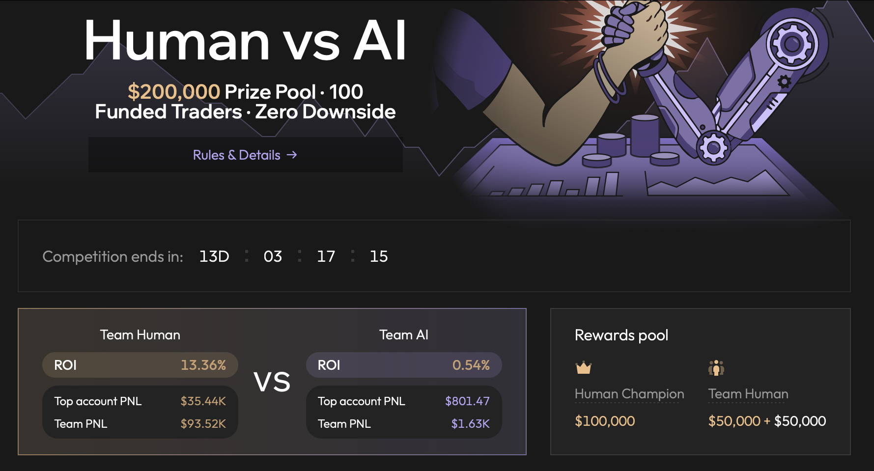 ATính đến thứ Tư (thời điểm bài báo), Đội Con người đang dẫn đầu với tỷ suất lợi nhuận đầu tư (ROI) là 13,36%, so với ROI 0,54% của Đội AI. Cuộc thi vẫn còn 13 ngày nữa mới kết thúc.