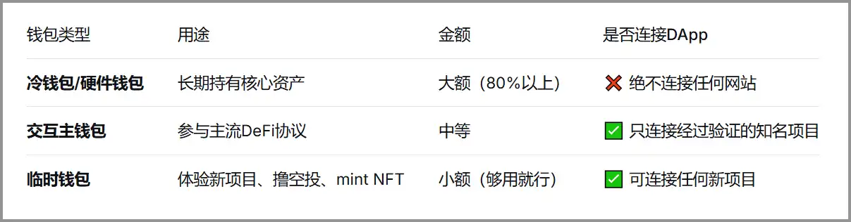 • Tham gia dự án mới hoặc giao thức chưa được kiểm chứng, nhất loạt sử dụng ví tạm thời, gửi số tiền tối thiểu để kiểm tra.