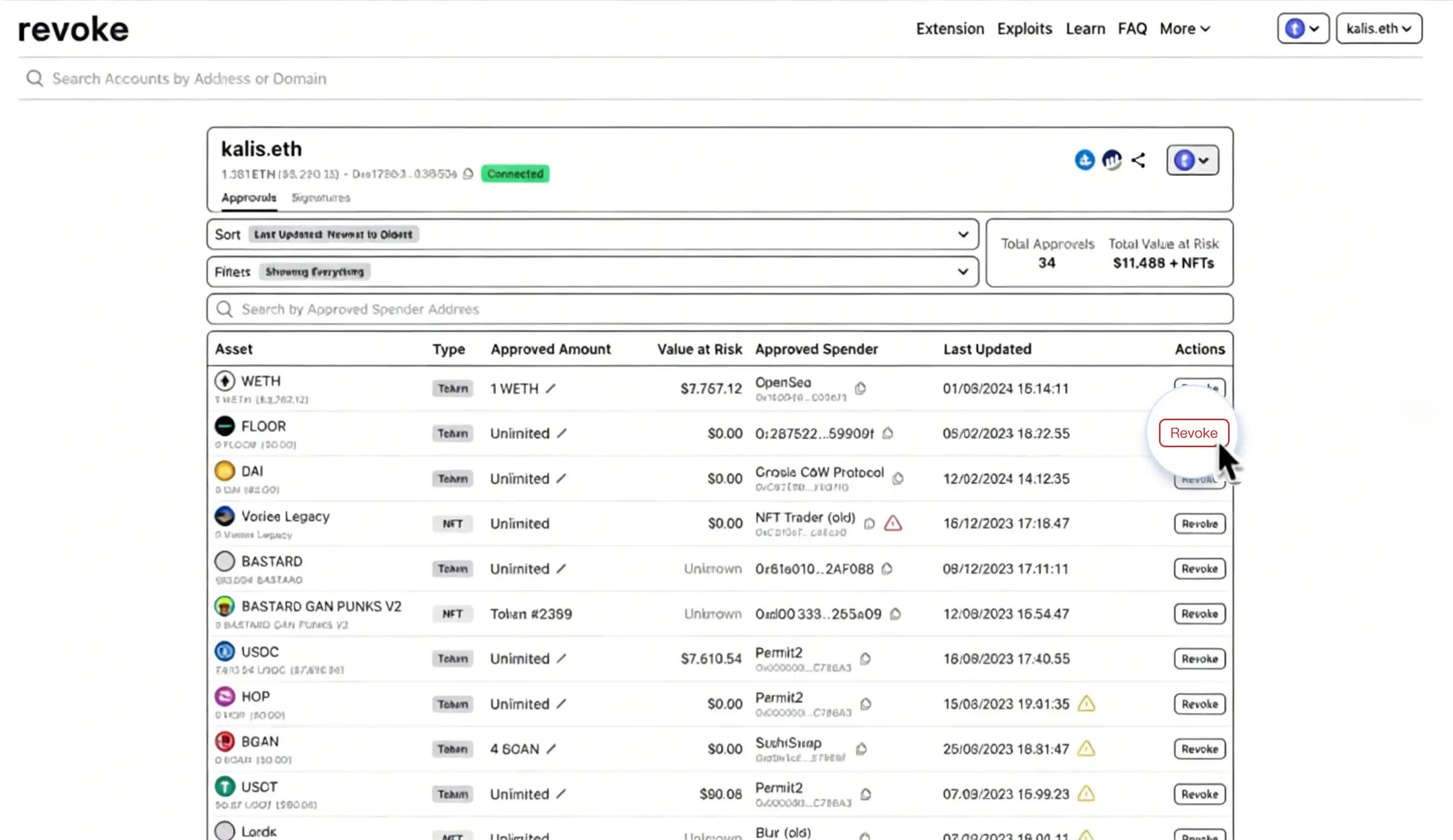 Giao diện ví dụ trên trang revoke.cash. Các ủy quyền "Unlimited" được khoanh tròn nên được thu hồi kịp thời.