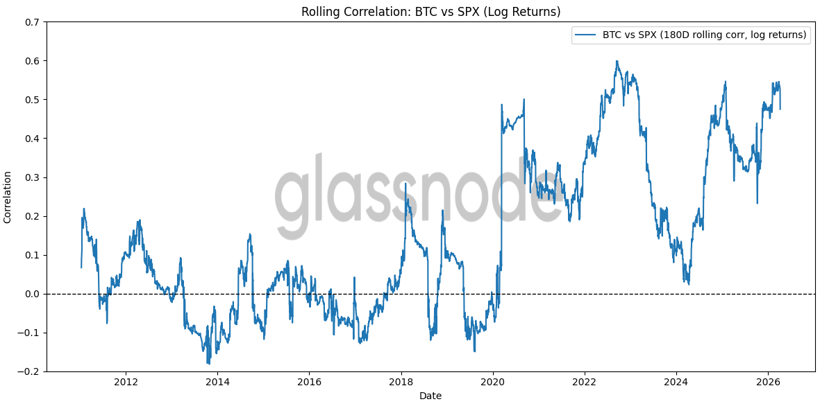 Biểu đồ trên vẽ mối tương quan trượt 180 ngày giữa Bitcoin và S&P 500 bằng cách sử dụng lợi nhuận log. Tín hiệu chính là BTC dường như đã trở nên nhạy cảm hơn theo thời gian với động lực vĩ mô và tài sản rủi ro rộng hơn. Trong những năm đầu, mối tương quan dao động quanh 0 hoặc đôi khi âm, trong khi những năm gần đây nó thường dương một cách đáng kể.