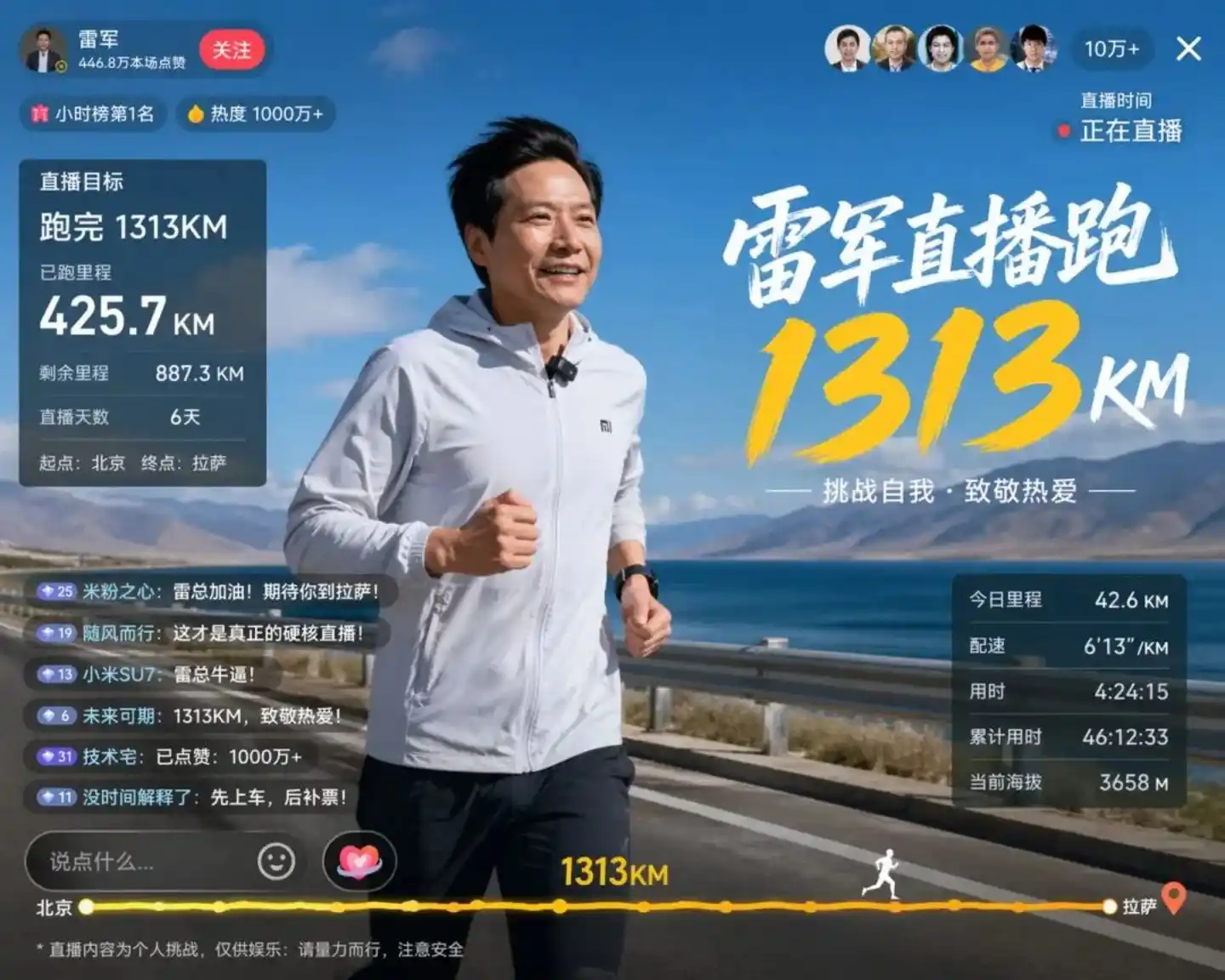 Bức ảnh này khiến không ít nhà phát triển hít một hơi dài. Đặc điểm khuôn mặt của ông Lôi được khôi phục chính xác — giống như ảnh chụp — trong ảnh còn hiển thị rõ ràng: Mục tiêu livestream 1313km, số km đã chạy 425.7km, số km còn lại 887.3km. Tuyệt hơn nữa, độ cao hiện tại ghi là 3658m.