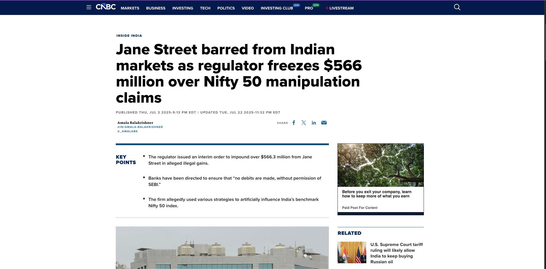 Jane Street bị cấm tham gia thị trường chứng khoán Ấn Độ, đã gửi hơn 560 triệu USD vào tài khoản ký quỹ và đã kháng cáo. Cho đến nay, vụ án vẫn đang được xét xử tại Tòa phúc thẩm chứng khoán Ấn Độ.