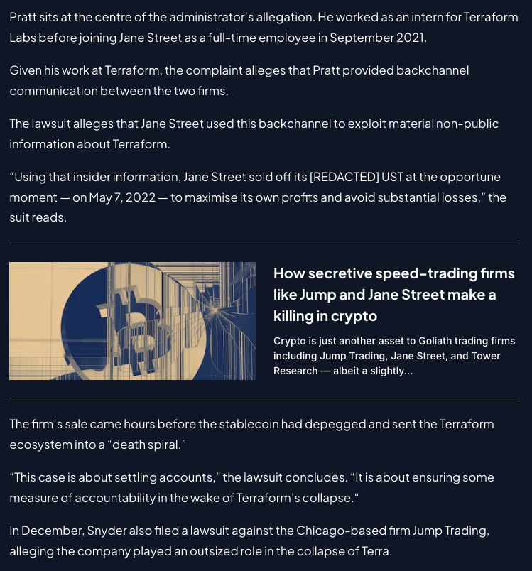 Đơn kiện nói rằng, một cựu thực tập sinh Terraform là Bryce Pratt, sau khi trở thành nhân viên toàn thời gian của Jane Street vào tháng 9/2021, đã thiết lập kênh liên lạc riêng tư với đồng nghiệp cũ và bị cáo buộc đã chuyển trực tiếp thông tin chưa công khai quan trọng về các biến động thanh khoản của Terraform cho đội ngũ giao dịch Jane Street.