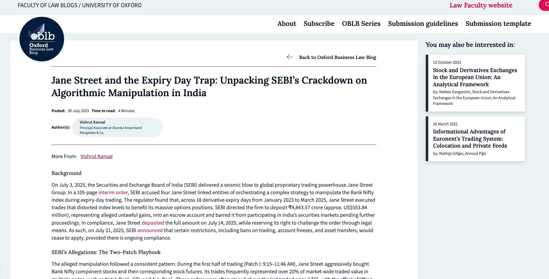 Tháng 7 năm 2025, Ủy ban Chứng khoán Ấn Độ (SEBI) đã đưa ra một trong những cáo buộc thao túng thị trường lớn nhất trong lịch sử nước này đối với Jane Street. Cuộc điều tra phát hiện, trong 18 ngày đáo hạn phái sinh từ tháng 1/2023 đến tháng 3/2025, Jane Street đã thực hiện thao tác "bơm rồi bán" (pump and dump) theo kiểu mẫu giáo khoa đối với chỉ số Bank Nifty.