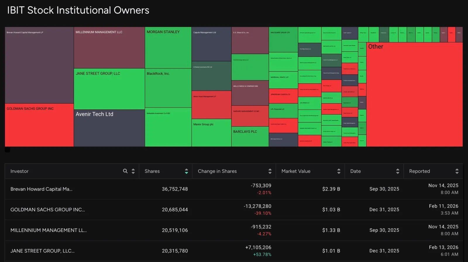 Báo cáo 13F của họ cũng xác nhận quy mô khổng lồ của họ. Theo báo cáo Q3/2025, Jane Street nắm giữ chứng chỉ quỹ IBIT trị giá 5.7 tỷ USD. Q4/2025 lại tăng thêm 276 triệu USD, nâng tổng lượng nắm giữ của họ lên hơn 20 triệu chứng chỉ, quy đổi theo giá cuối năm vào khoảng 790 triệu USD. Mức tiếp xúc đỉnh điểm của họ từng gần chạm 2.5 tỷ USD IBIT.
