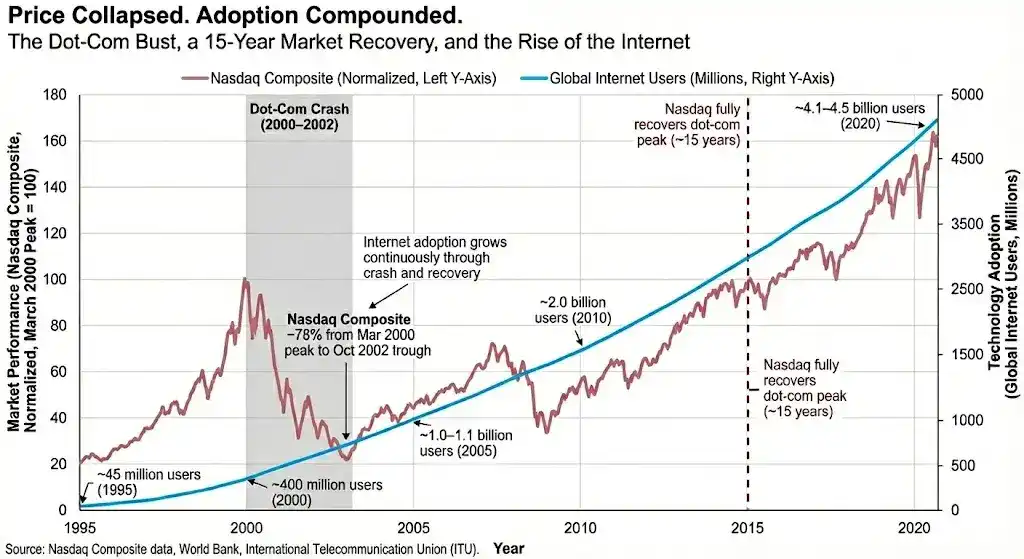 Kịch bản này không phải lần đầu xuất hiện. Thời kỳ bong bóng Internet vỡ, chỉ số Nasdaq giảm khoảng 78%, trong khi đó số lượng người dùng Internet lại tăng vọt gấp ba lần, cơ sở hạ tầng băng thông rộng được triển khai toàn diện. Thị trường mất nhiều năm mới hồi phục, và giờ đây Internet đã âm thầm định hình lại thế giới, khi các nhà đầu tư vẫn đang liếm vết thương, phần mềm đã "nuốt chửng" toàn bộ thế giới.