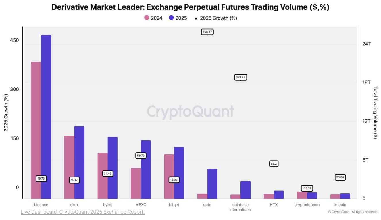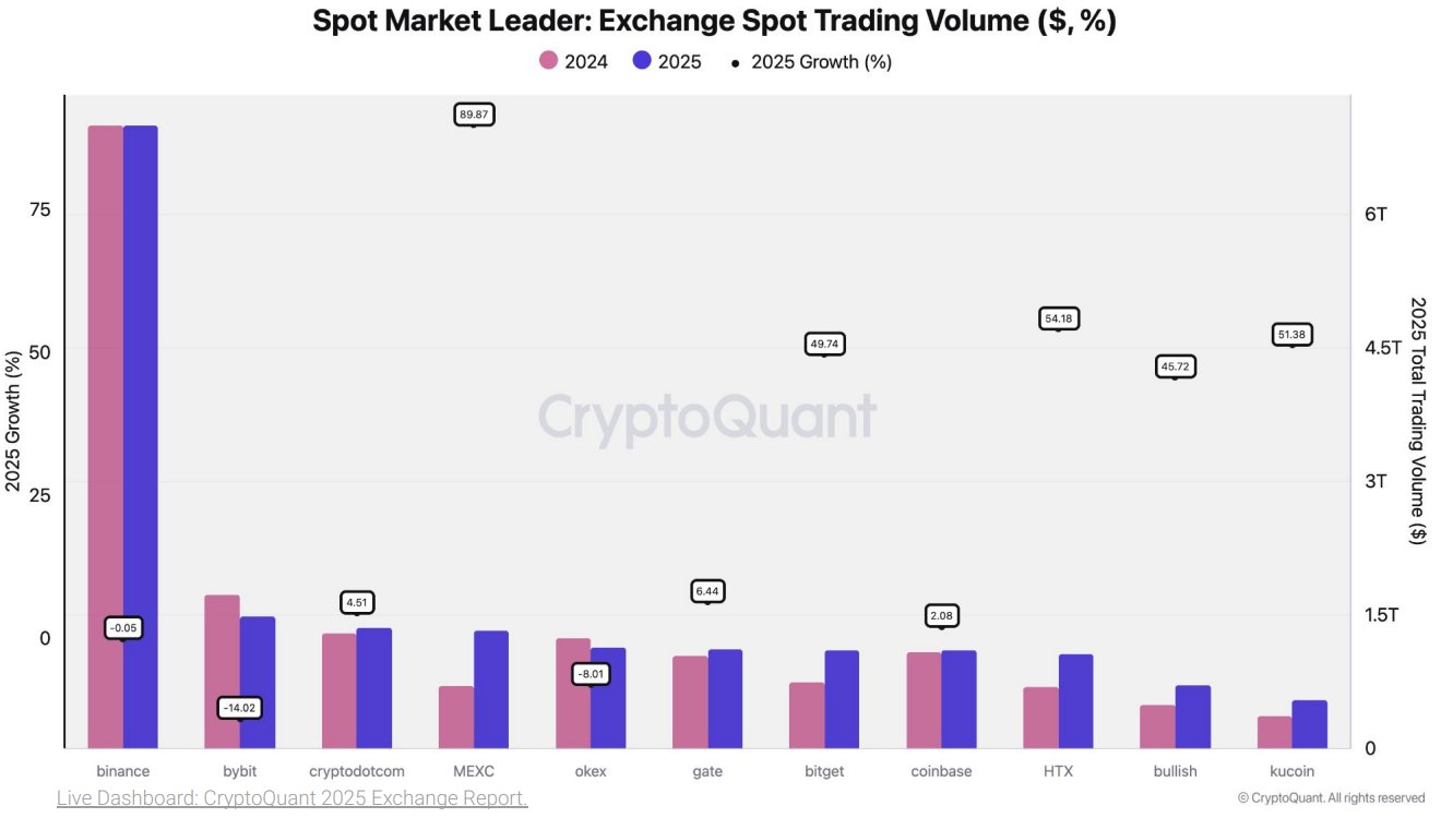 Binance tiếp tục là nhà dẫn đầu về khối lượng giao dịch giao ngay trong lĩnh vực tiền điện tử vào năm 2025, theo báo cáo thường niên về các sàn giao dịch của CryptoQuant.