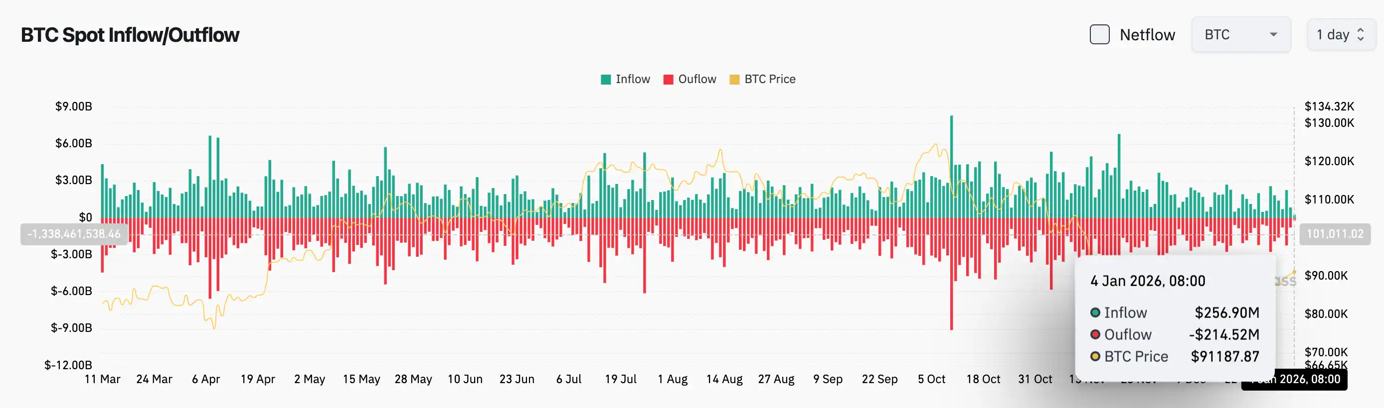 4, Trong 24 giờ qua, dòng tiền mặt BTC ròng vào khoảng 0,42 triệu USD, với dòng vào khoảng 256 triệu USD và dòng ra khoảng 214 triệu USD.