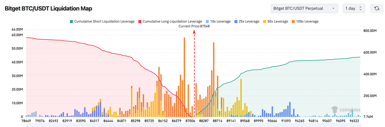 3. Bản đồ thanh lý Bitget BTC/USDT cho thấy: Dưới mức khoảng 87,548 USD hiện tại của BTC tập trung một lượng lớn thanh lý mua (màu đỏ), cho thấy nếu giảm xuống dưới mức 87k, có thể kích hoạt dừng lỗ liên tiếp cho các lệnh mua, làm trầm trọng thêm biến động giảm. Trong khoảng từ 88k–92k phía trên, thanh lý bán (màu xanh lá cây) dần tích lũy, một khi có đột phá tăng, dễ dàng hình thành nén bán, đẩy giá tăng nhanh.
