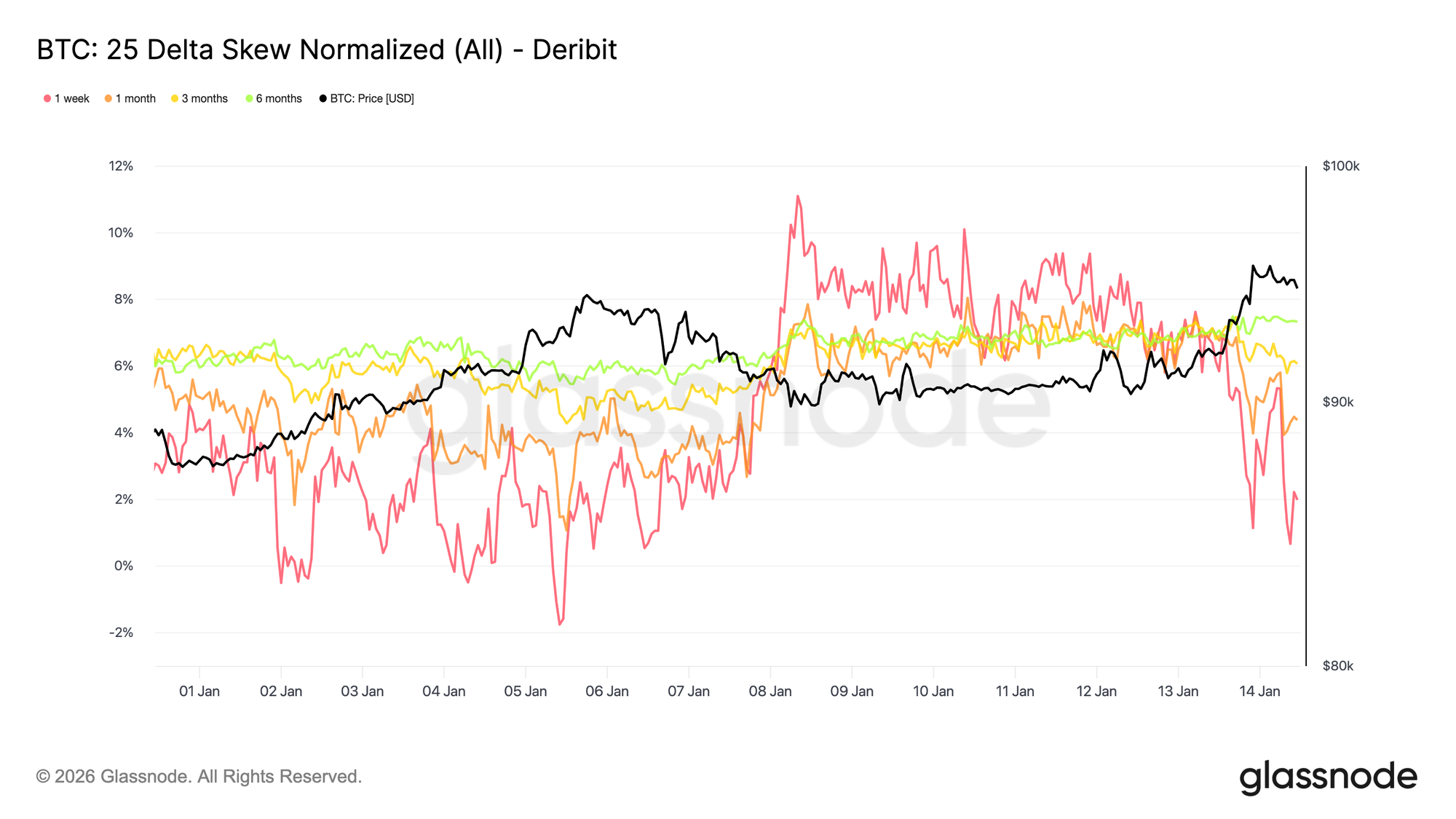 Điều này phản ánh một thị trường thoải mái duy trì mức độ tiếp xúc nhưng không sẵn sàng làm như vậy mà không có bảo hiểm. Sự bảo vệ đang được duy trì hơn là được bổ sung một cách mạnh mẽ, báo hiệu sự thận trọng hơn là căng thẳng. Độ nghiêng kỳ hạn ngắn đã chuyển dịch ngắn về phía cân bằng trước khi xoay trở lại ủng hộ quyền chọn bán, trong khi độ nghiêng kỳ hạn dài hầu như không phản ứng với động thái trở lại trên 95K.