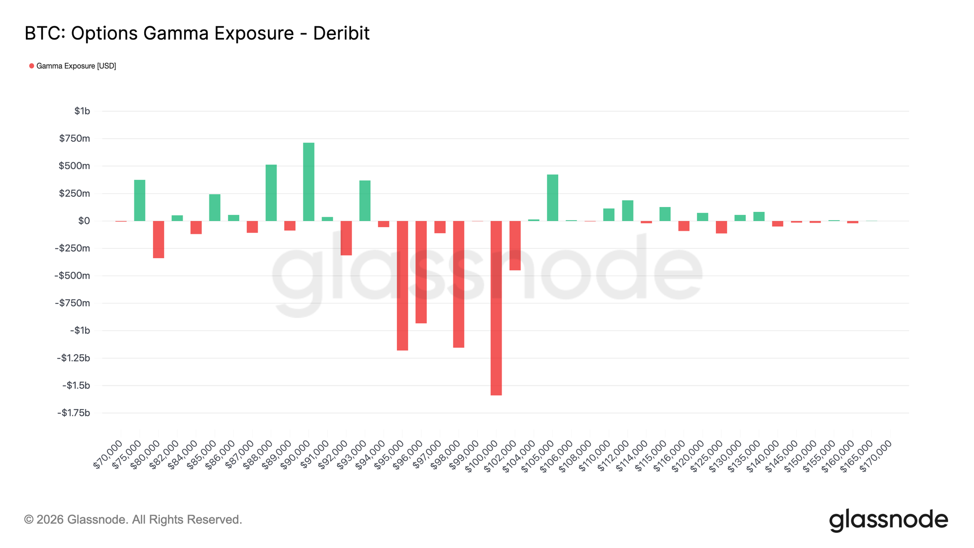 Phân bố strike hiện tại đặt các nhà tạo lập thị trường (dealers) vào vị thế gamma ngắn xung quanh giá giao ngay, làm thay đổi động lực ngắn hạn của thị trường. Trong môi trường gamma ngắn, các dòng tiền phòng ngừa rủi ro không còn hấp thụ các biến động giá. Thay vào đó, chúng có xu hướng củng cố chúng, với các nhà tạo lập thị trường mua vào khi giá tăng và bán ra khi giá giảm.