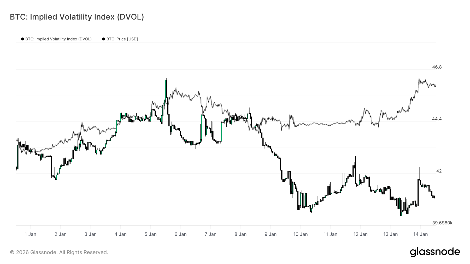Hiện tại, DVOL vẫn tương đối thấp và trong biên độ, ngay cả khi giá giao ngay đã di chuyển qua các mức then chốt. Điều này xác nhận những gì cấu trúc kỳ hạn và độ nghiêng đã gợi ý: thị trường quyền chọn không sẵn sàng trả giá cao cho biến động ngay lập tức. Sự không chắc chắn được thừa nhận, nhưng nó không được thể hiện thông qua định giá biến động tổng hợp cao hơn.
