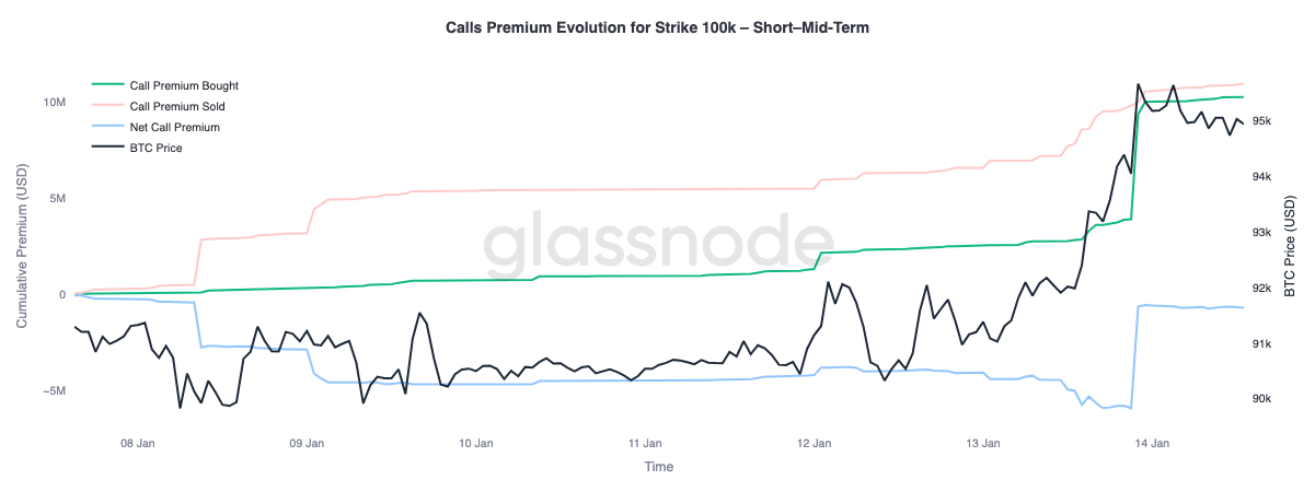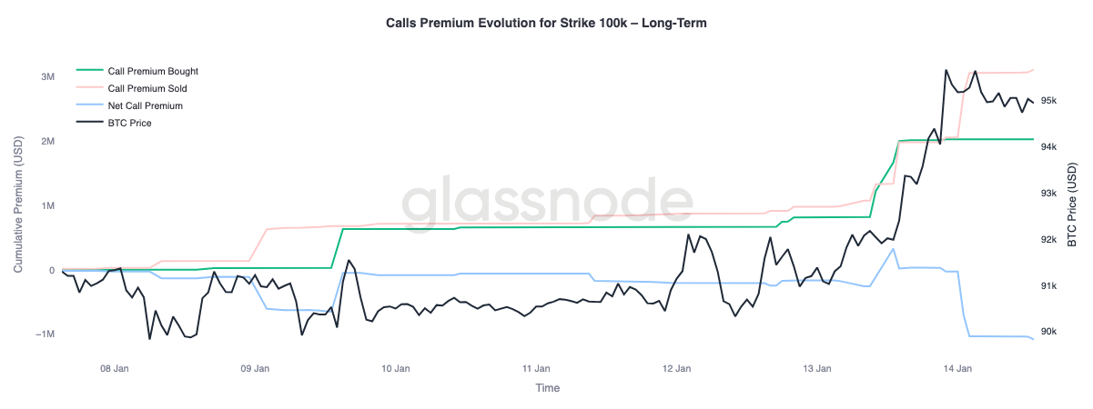 Cái nhìn kỹ hơn vào hành vi phí bảo hiểm của strike call 100K làm nổi bật sự phân kỳ rõ ràng trên các kỳ hạn. Mức này vẫn là ngưỡng tâm lý chính tiếp theo, và dòng tiền quyền chọn cho thấy thị trường đang định vị xung quanh nó như thế nào.