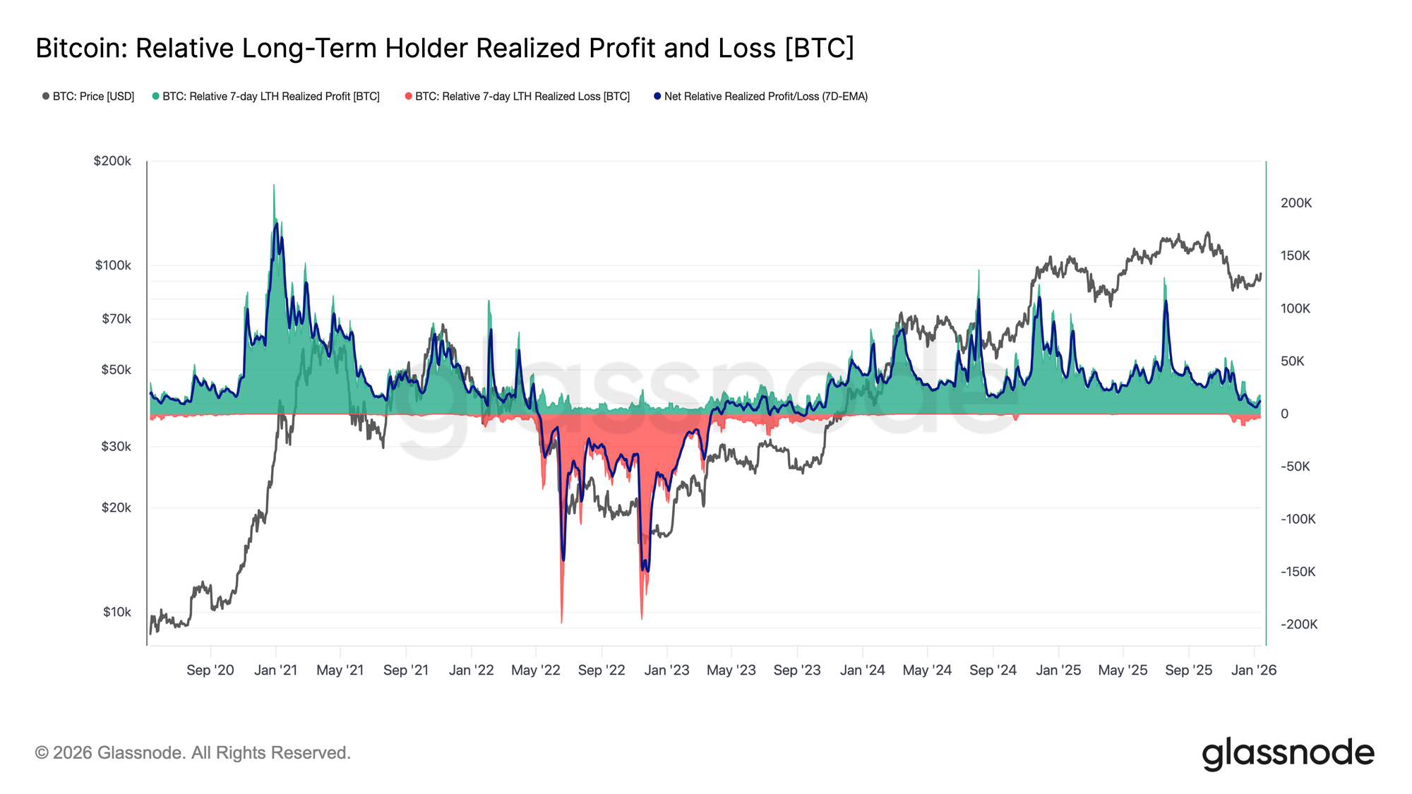 Hiện tại, các nhà nắm giữ dài hạn đang thực hiện khoảng 12,8 nghìn BTC lợi nhuận ròng mỗi tuần, một sự chậm lại đáng kể so với các đỉnh chu kỳ trên 100 nghìn BTC mỗi tuần. Sự điều tiết này cho thấy việc chốt lời vẫn đang diễn ra, nhưng ít mạnh mẽ hơn nhiều so với các giai đoạn phân phối trước đó.