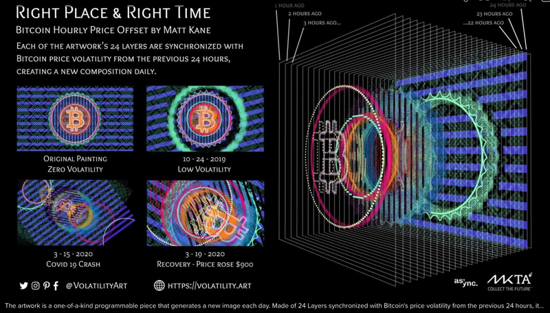 Vào năm 2020, một nhóm có trụ sở tại San Francisco hoạt động trong lĩnh vực nghệ thuật kỹ thuật số có thể lập trình đã công bố một tác phẩm nghệ thuật được thiết kế để thay đổi hình thức bề ngoài phù hợp với biến động giá Bitcoin. Dự án, Right Place & Right Time của nghệ sĩ Matt Kane, đã sử dụng dữ liệu thị trường BTC làm đầu vào trực tiếp, cho phép những thay đổi trong giá trị của cryptocurrency thúc đẩy những thay đổi trực quan trong tác phẩm.