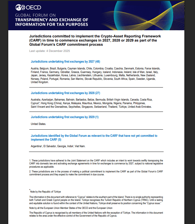 Theo giám sát chính thức từ Tổ chức Hợp tác và Phát triển Kinh tế (OECD), 48 khu vực pháp lý cam kết bắt đầu thu thập dữ liệu giao dịch tiền mã hóa và dữ liệu người dùng được chuẩn hóa từ ngày 1 tháng 1 năm 2026, với các cuộc trao đổi xuyên biên giới tự động đầu tiên dự kiến diễn ra vào năm 2027.
