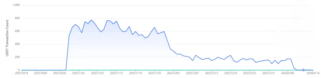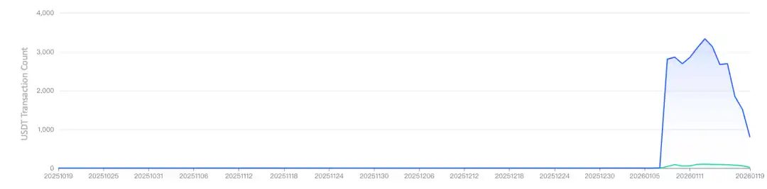 Hiện tại, một số thương nhân từ Tudou Guarantee sau khi được hoàn cọc đã chuyển thẳng sang Xinbi Guarantee (Bảo lãnh Tân tệ) để tiếp tục đặt cọc và hoạt động kinh doanh. Dữ liệu hoạt động trên chuỗi của các địa chỉ đặt cọc này được thể hiện dưới đây. Từ ngày 8 đến ngày 16 tháng 1, số giao dịch USDT chảy vào các địa chỉ đặt cọc của Xinbi Guarantee duy trì ở mức 2700-2800 giao dịch/ngày, cho thấy khối lượng giao dịch tăng vọt: