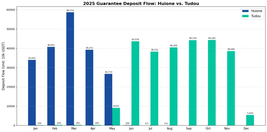 Tudou Guarantee là một nền tảng cung cấp dịch vụ bảo lãnh cho các hoạt động xám/đen thông qua Telegram. Sau khi Huione Guarantee (Bảo lãnh Huione) bị Telegram đóng cửa vào tháng 5 năm 2025, nó đã trở thành người kế nhiệm chính của Huione Guarantee. Thông qua việc mua lại cổ phần, chuyển hướng khách hàng, v.v., Huione Guarantee đã chuyển dịch vụ sang Tudou Guarantee. Dòng tiền đặt cọc của hai nền tảng này trong năm 2025 được thể hiện trong biểu đồ dưới đây: