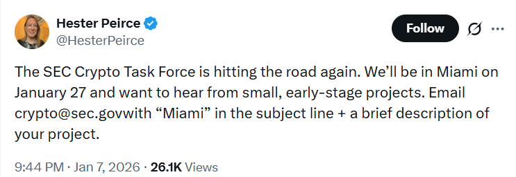 Ủy ban Chứng khoán và Giao dịch Hoa Kỳ (SEC) đã thông báo rằng lực lượng đặc nhiệm về Tiền mã hóa của họ sẽ đến Miami vào ngày 27 tháng 1 để gặp gỡ trực tiếp các nhà xây dựng và Startup giai đoạn đầu trong lĩnh vực Tiền mã hóa. Mục tiêu chính là lắng nghe cộng đồng Tiền mã hóa và thu thập phản hồi trước khi hoàn thiện các quy định mới về Tiền mã hóa.