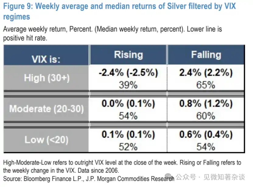 Ở thị trường bạc, hiệu ứng lây nhiễm trú ẩn này thậm chí còn rõ rệt hơn, trong môi trường VIX cao và đang tăng, giá bạc giảm khoảng 61% thời gian, mức giảm trung bình hàng tuần hơn 2%. Tương tự trong động thái này, đồng USD mạnh lên ban đầu cũng có thể phát huy tác dụng, bởi vì trong khoảng VIX cao và đang tăng, chỉ số USD DXY có lực mua bất đối xứng mạnh.