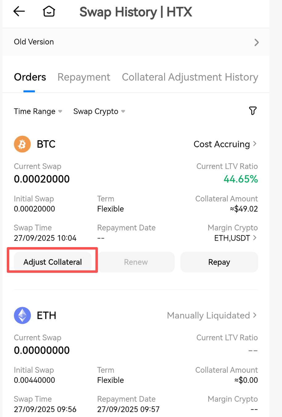 1. Chọn lệnh vay và nhấp "Điều chỉnh tài sản đảm bảo".