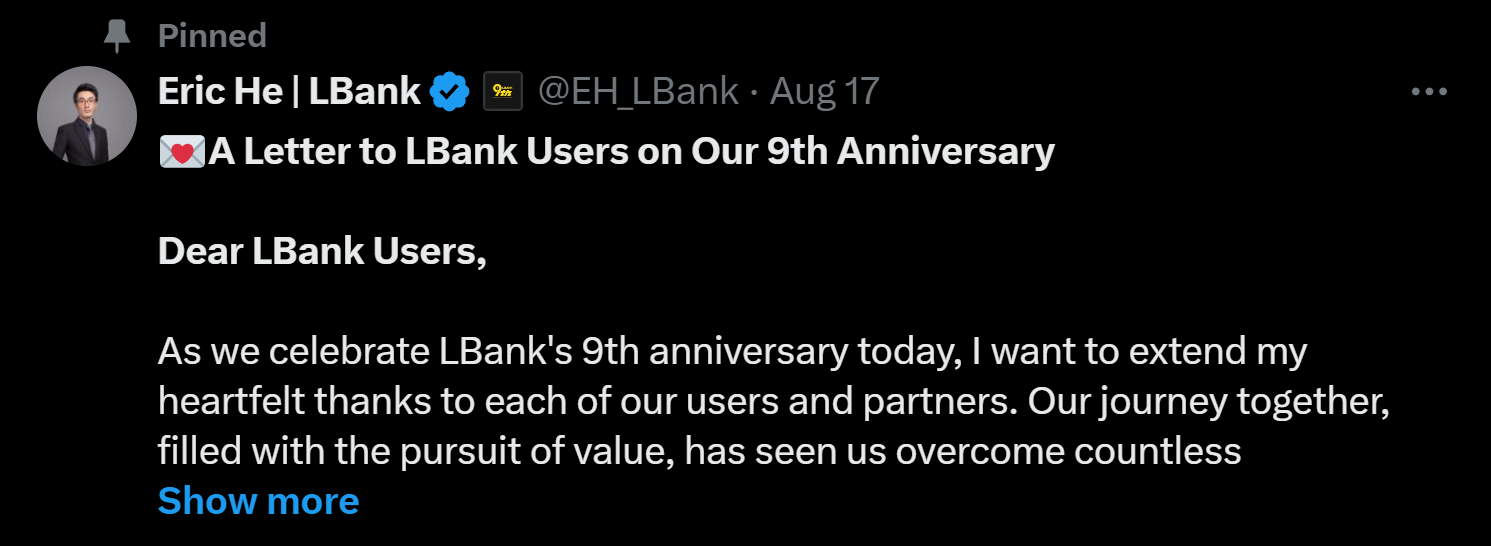 8月17日,LBank创始人兼CEO Eric He在社交媒体上发布了一封庆祝LBank成立九周年的公开信。在信中,Eric He简要回顾了LBank的九年历程,并宣布了“资产补齐”战略计划,明确表示将LBank逐步从以meme币为主的差异化交易所升级为综合性交易所。