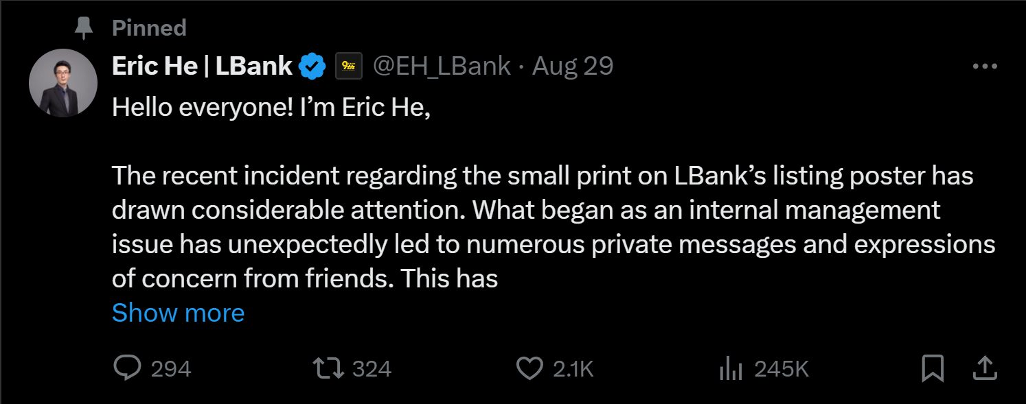 随后,Eric He在8月29日的推特上发布了一封反思信,将此次事件推向高潮。这封信着重提到了LBank在内部管理和社区互动方面进行的重要战略调整,也展示了Eric He个人角色的转变。