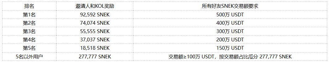 ● 总奖池为138,750 SNEK(价值750 USDT),根据用户完成注册及交易时间先后排序,先到先得,发完为止。