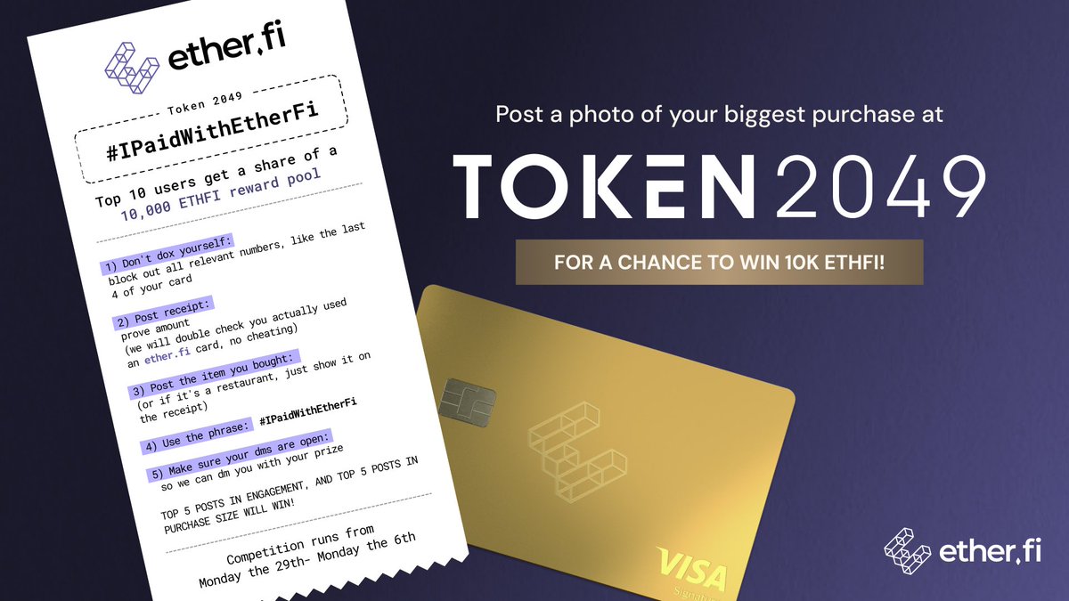 🚨10K ETHFI赠品🚨从俱乐部到奢侈手表,Token2049新加坡是消费的理想场所。为庆祝,我们将赠送10K ETHFI给最大的和最具病毒传播性的消费达人。发布您最大的消费,使用#ipaidwithetherfi - 并标记我们@ether_fi以获取转发。规则:
