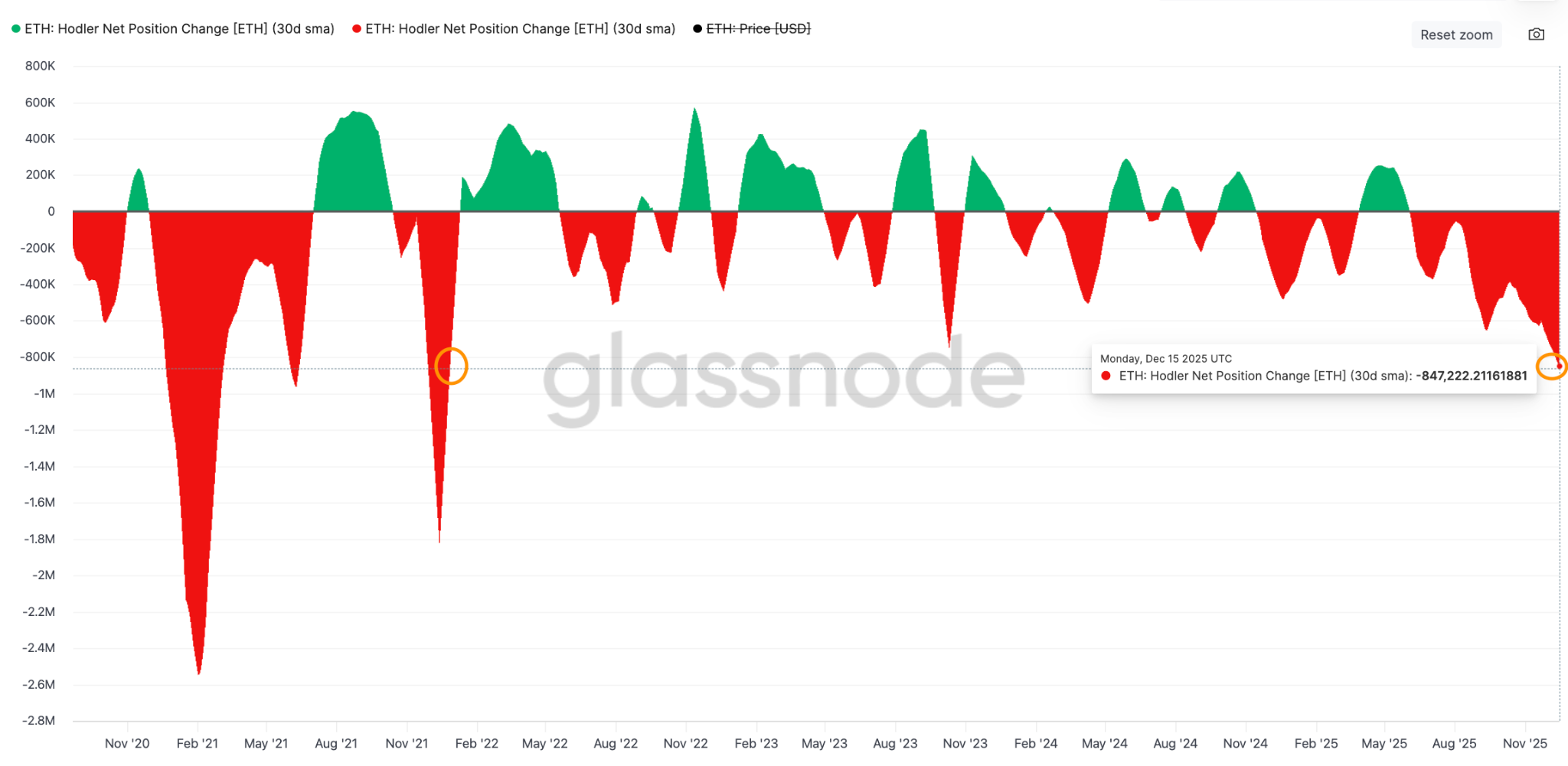 与此同时,长期持有者的抛售行为进一步加剧了市场压力。过去 30 天内,以太坊长期持有者供应量减少 847,222 枚,创下 2021 年 1 月以来的最大单月降幅。