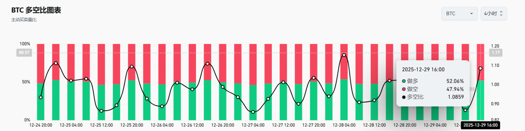 4、 过去4小时,BTC合约全网多空比为1.0859,多头占优势。