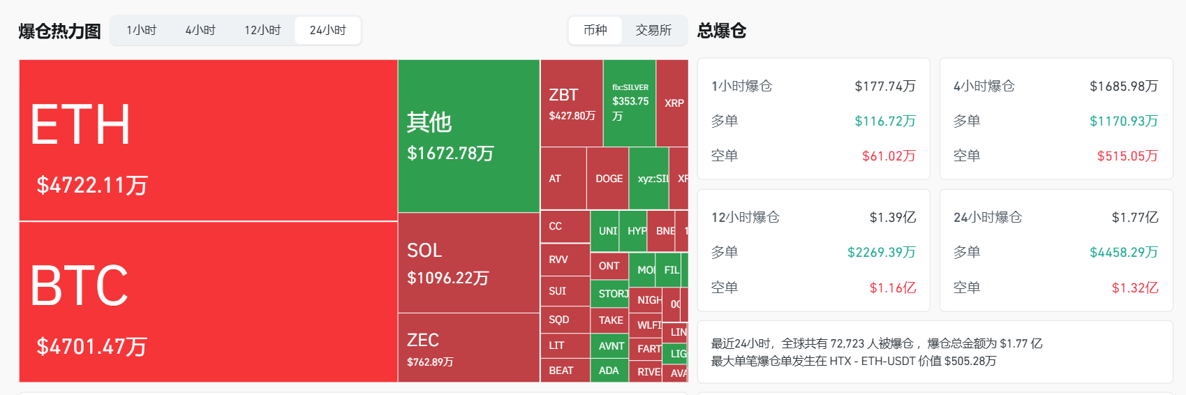 3、 最近24小时,全球共有72,723人被爆仓 ,爆仓总金额为 $1.77亿。