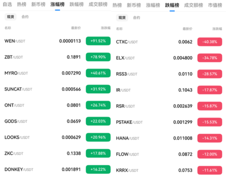 2、 火币涨幅榜TOP3的代币为:WEN (91%)、ZBT(78%)、MYRO(40%)。