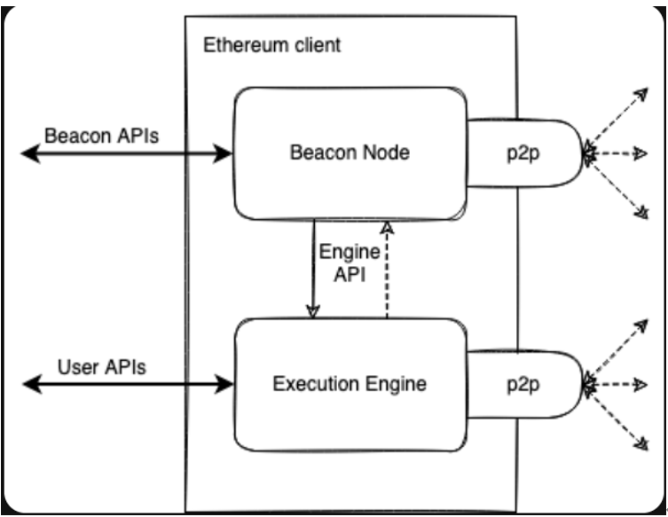 合并后,以太坊的执行性和共识层平行运行,二者通过引擎API的接口进行通信或信息互通。引擎API允许执行客户端向共识客户端请求区块信息,也允许共识客户端向执行客户端发送新区块或请求执行有效性证明(Execution Validity Proof)等。