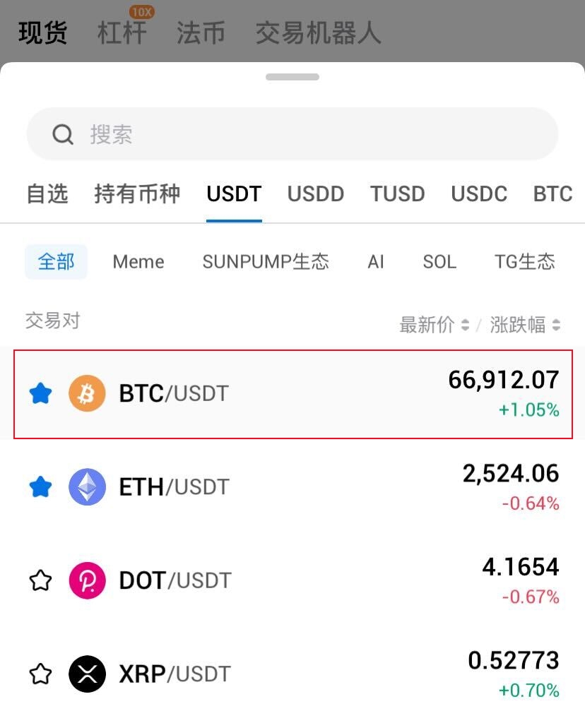 2. 选择交易对,如BTC/USDT。意思是BTC和USDT之间的交易,买入BTC需使用USDT,卖出BTC会得到USDT。