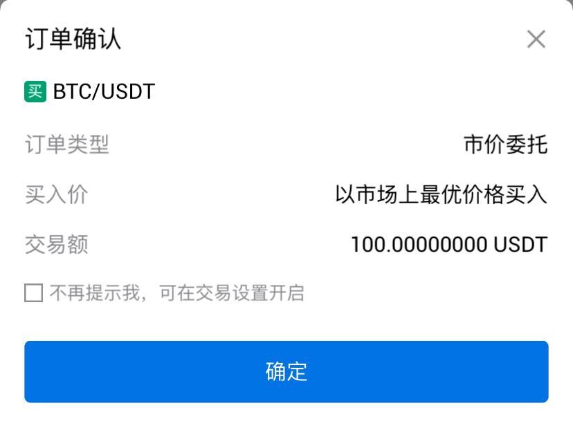 4. 确认订单,因为是市价委托,所以会以当前市场价格立即成交。