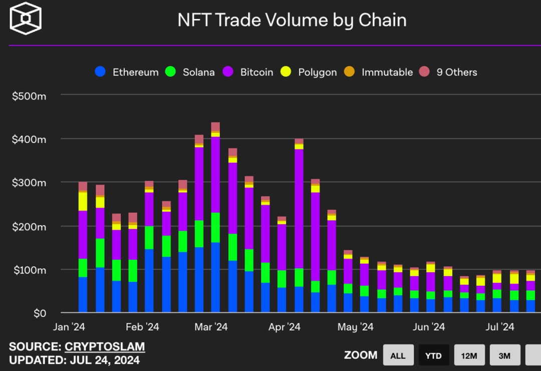 比特币网络凭借其卓越的稳定性和安全性,不仅为BTC赋予了持久的价值,还积累了令人瞩目的资本。随着BTC现货ETF的获批,传统资金的大规模涌入推动其市值突破1.3万亿美元。然而,人们经常忽视比特币作为网络和 BTC 作为数字资产之间的区别,要发挥比特币的全部潜力,关键在于利用网络功能,将比特币从单纯的价值存储转变为比特币经济的核心基础设施。2022年12月,Ordinals协议的横空出世为比特币生态系统带来了一场意想不到的革新。"铭文"的爆火不仅将大众和开发者的目光聚焦到比特币生态,更让人们看到了释放比特币巨大潜能的可能性。短短12个月内,基于Ordinals的比特币铭文代币总市值就突破35亿美元,展现了惊人的增长速度。即使在今天,比特币网络上每日NFT的交易额都要大于Solana。