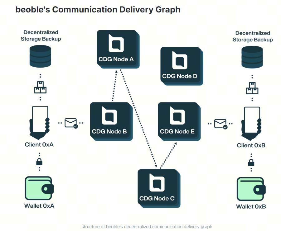 传统社交应用的数据主要存储于中心化服务器和数据库,比如Telegram 和 Facebook Messenger等,其往往存在中心化的风险。目前虽然一些公链可以实现去中心化,但同时面临隐私、Gas费高昂等问题。Beoble 设计了一种完全去中心化且保护隐私的通信方案——通信传递图谱(CDG)。CDG 是 Beoble 独特的社交网络,其通过端到端加密、多层加密、去中心化存储等方式,以解决Beoble在去中心化情境下消息传递的高度隐私性。