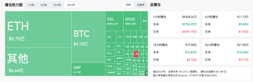 全网合约市场清算超 20亿美元:数据显示,在比特币暴跌过程中,全网加密货币合约市场的清算量达到20亿美元,其中 80% 以上是多头头寸。