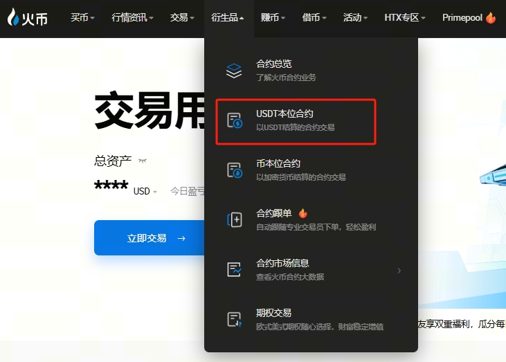 1. 打开火币官网www.htx.com,登录账号后选择“衍生品-USDT本位合约”。