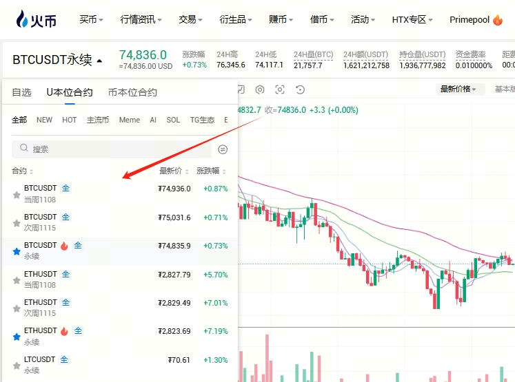 2. 鼠标悬停在左上角币对处,随后在弹窗中选择要交易的币对,如BTCUSDT永续。