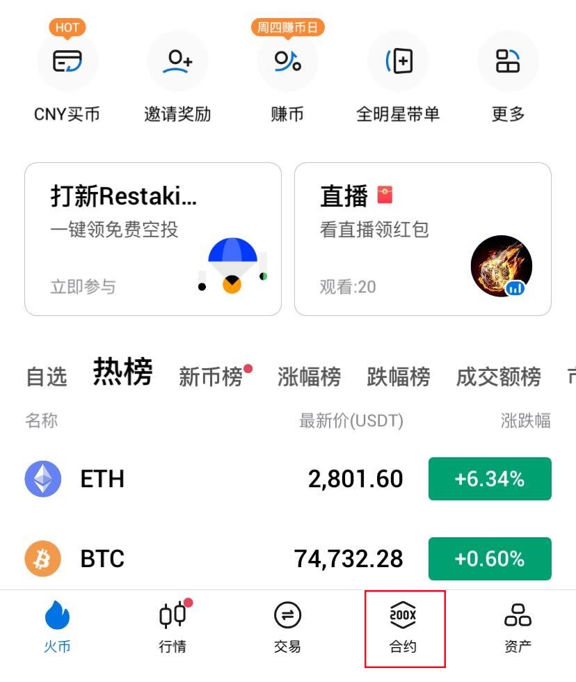 1. 打开火币APP并登录账号,点击下方的“合约”,进入合约交易页面。
