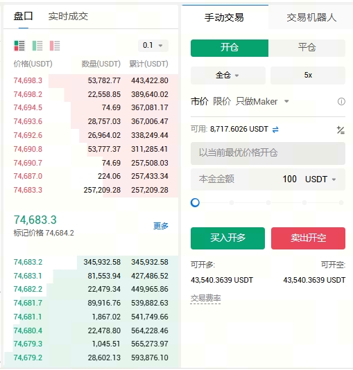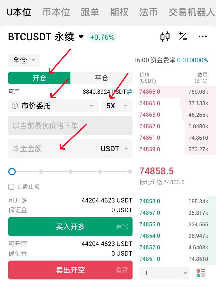 3. 选择“开仓”,选择委托方式,如“市价委托”;调整杠杆倍数如5倍;输入开仓数量,如100 USDT;根据对走势的判断,如果认为BTC会涨则点击“买入开多”,认为会跌则点击“卖出开空”。