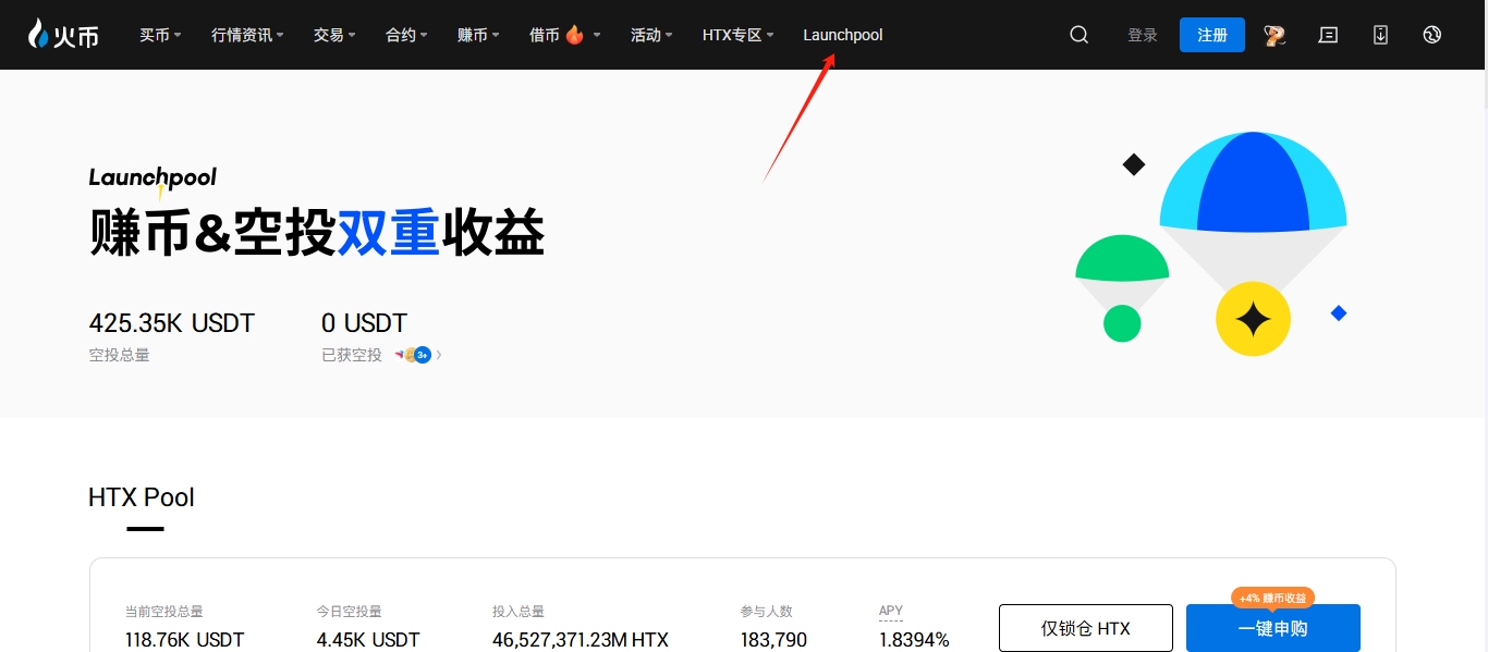 1. 打开火币官网www.htx.com,登录账号后,在导航栏点击“Launchpool”。