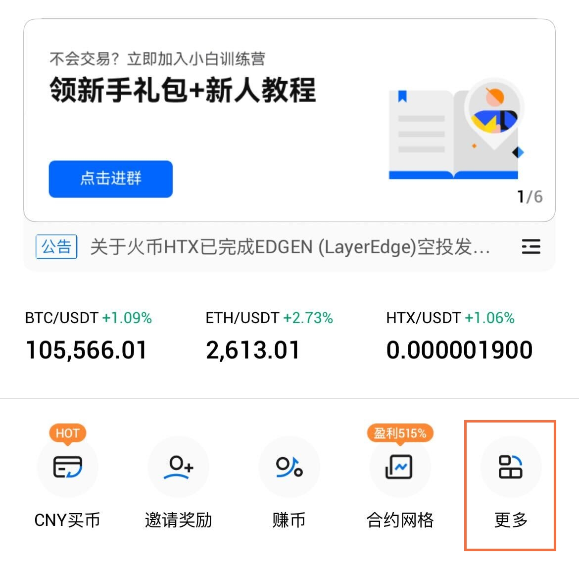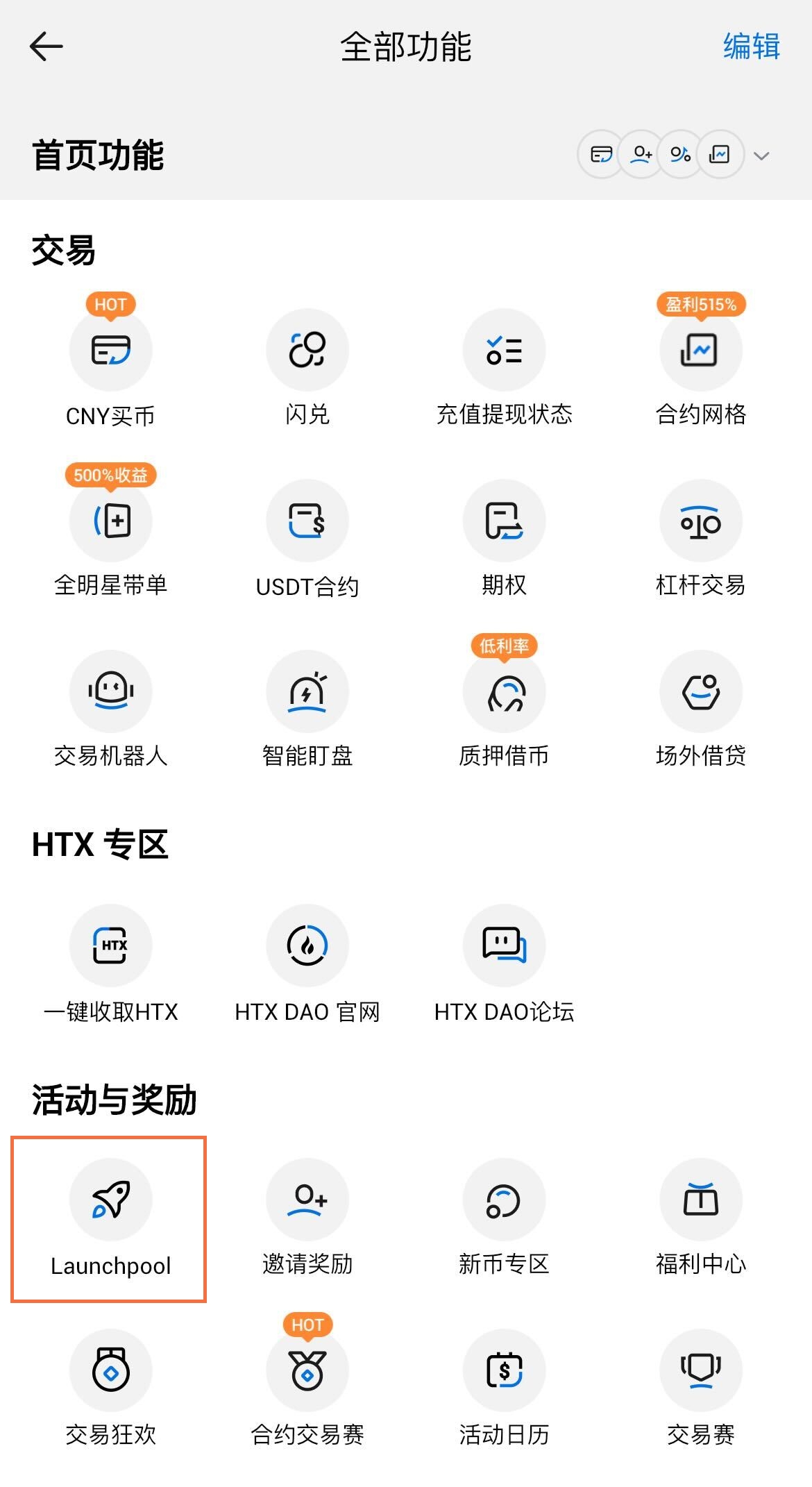 1. 打开火币APP,在首页导航栏点击更多,随后找到“Launchpool”点击进入活动页面。