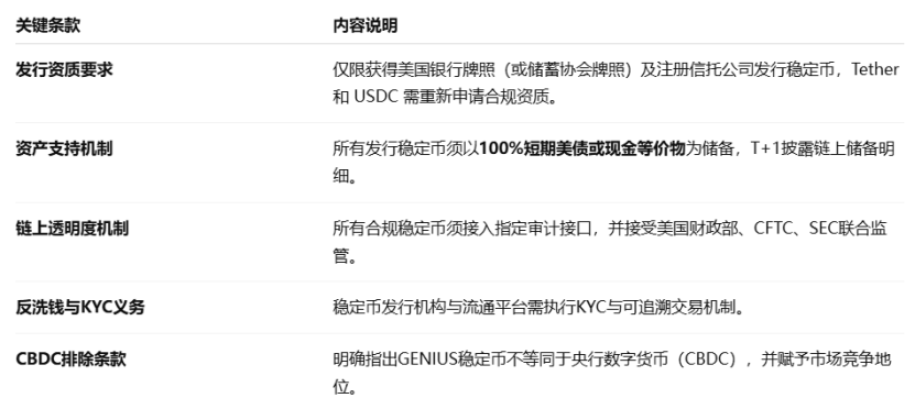 从条文设计来看,该法案要求所有稳定币必须由获得美国联邦或州层级的银行或注册信托机构发行,并以100%的现金或短期美债为储备资产,每日向公众披露储备情况,接受财政部、SEC和CFTC三方监管。换言之,未来稳定币不仅要“合规”,还必须“链上可审计”,这种高标准直接瞄准了目前USDT等传统稳定币模式中存在的信用隐患与审计不透明问题。法案还特别设有CBDC排除条款,明确其目标并非推动央行数字货币,而是构建以市场为主导的“稳定币自由竞争体系”,这一点在当前政治氛围中极具现实意义,也为市场化美元稳定币的长期发展扫清障碍。