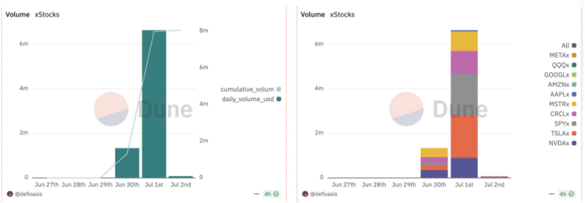 相比之下,Kraken 与其合作方推出的 xStocks 生态体系提供了另一种路径想象。该方案以 Solana 链为基础,由 Backed 提供底层资产代币,通过结构化合规方式绕开美国监管,将产品面向全球非美市场开放。xStocks 最大的特色在于其交易属性的“DeFi 化”:所有代币可 24/7 全天候交易,具备 T+0 结算、链上互换、与稳定币做市等功能,理论上能够整合入现有 DeFi 工具链如借贷、永续合约、跨链流动性桥接等。该体系也尝试通过链上流动性池的方式聚集交易深度,并与 Orca、Jupiter 等 Solana 原生 DEX 建立初步连接。这种链上原生、全球分发、可组合的属性无疑代表了代币化股票的“终极愿景”,即不仅仅做成价格映射产品,而是构建一个真正融合传统金融资产与加密基础设施的交叉市场。然而,xStocks 目前的最大难题仍在于用户覆盖范围受限、真实申购/赎回仍需 KYC 审核,以及其托管路径是否具备跨国法律效力尚无定论。此外,虽然其交易体验与机制已达“加密原生”标准,但实际用户规模和链上流动性仍未形成规模效应,距离主流采用仍有较长路要走。