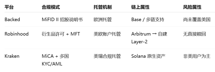 在所有关于代币化股票的讨论中,监管始终是悬在头顶的达摩克利斯之剑。股票作为受监管最严密的金融资产之一,其发行、交易、托管、清算等各个环节都受到所在司法辖区法律的严格约束。在传统金融中,证券必须通过注册或获得豁免才能合法销售,交易场所也需取得交易所或 ATS(另类交易系统)等相关执照。将这些证券以“链上资产”的方式重构,意味着不仅要解决技术映射的问题,更必须对接清晰可执行的合规路径。否则,即使产品设计再优秀,也很难突破使用范围受限、无法面向合格投资者推广、甚至可能触及非法证券发行的法律风险。在这一方面,不同项目的选择与差异尤为鲜明,也恰恰决定了它们未来能否真正走向规模化落地。